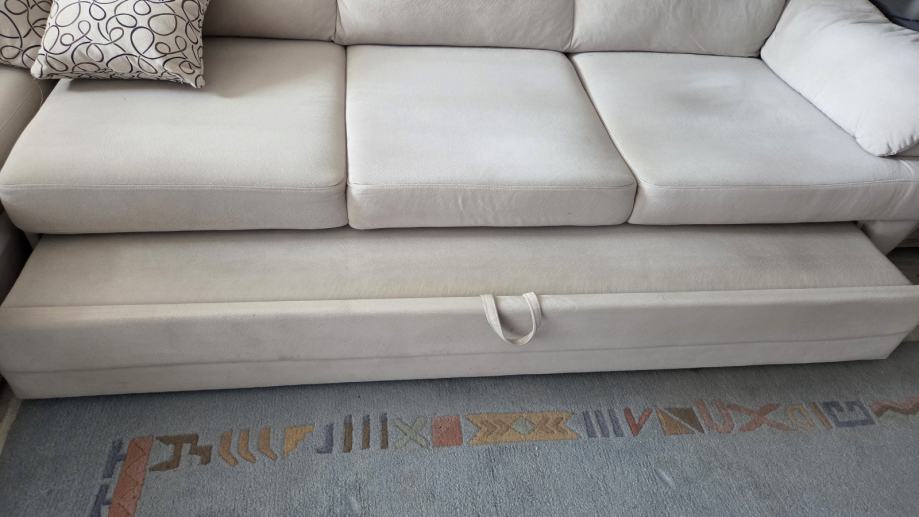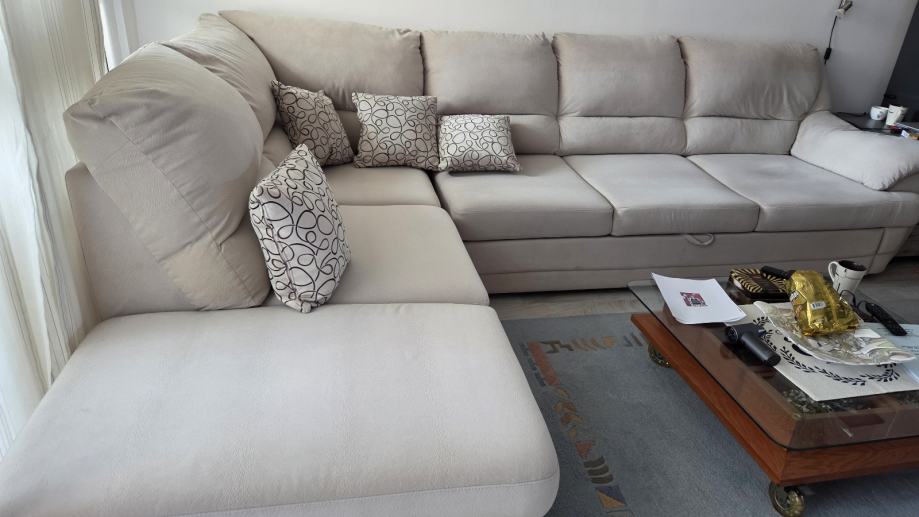Prodaje se kutna garnitura, boja neutralna ( siva ) : dužina trosjeda 216 , ukupna dužina sa kutom 309, dubina 93, dužina kutnog dvosjeda 220.