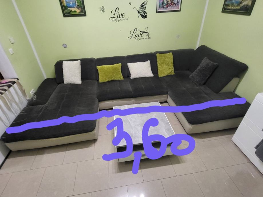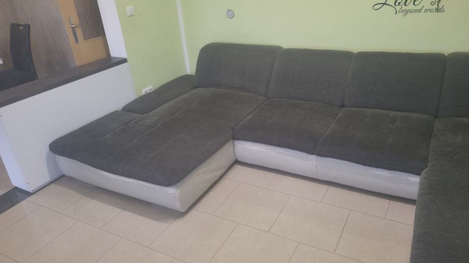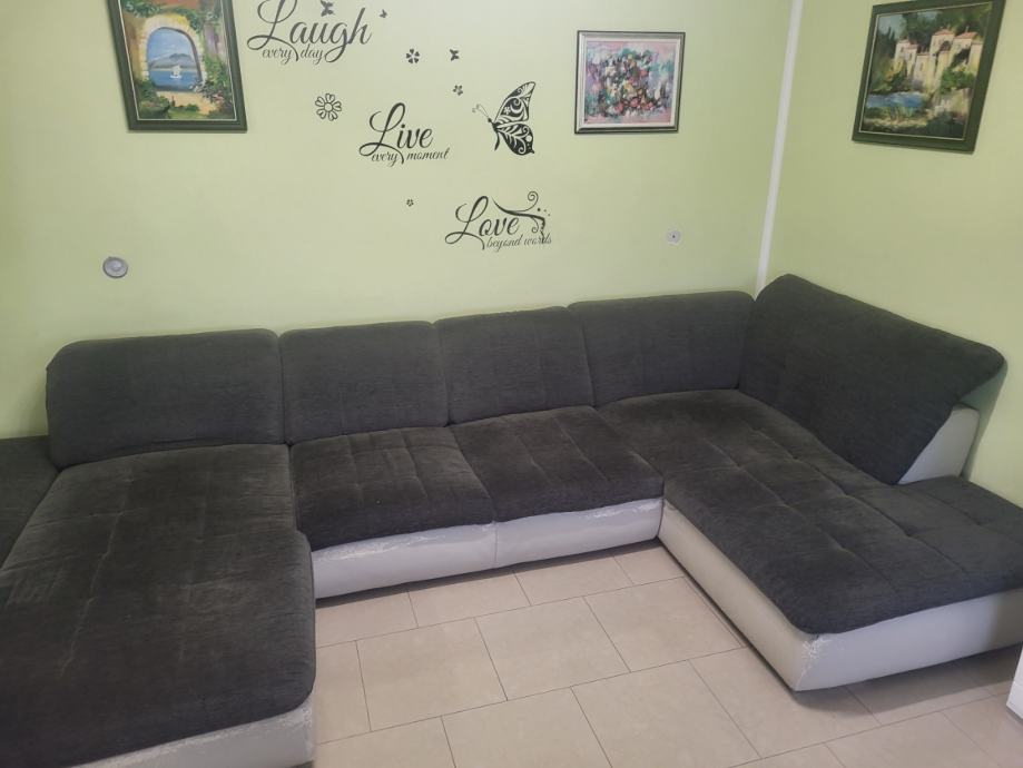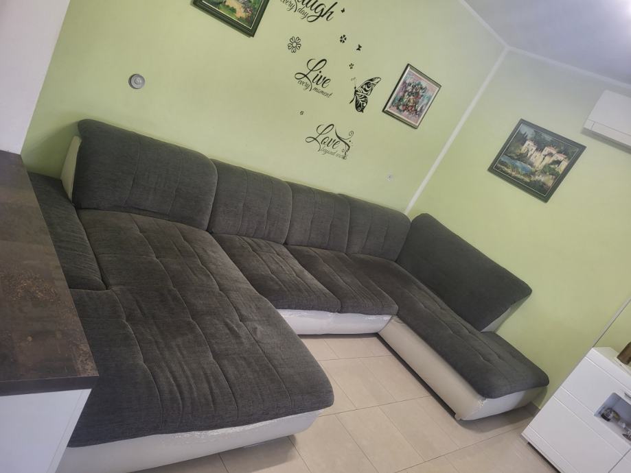 Prodajem kutnu garnituru u obliku slova U, tamnosive boje s bijelom eko kožom na donjem dijelu. Garnitura je prostrana i nudi dosta mjesta za sjedenje, s mekim jastucima za naslon. Duljina iznosi oko 3,60 metara.