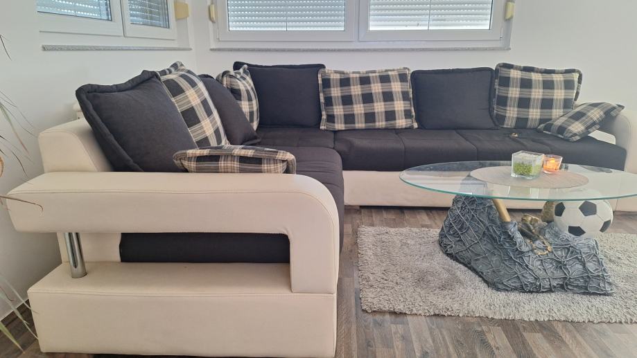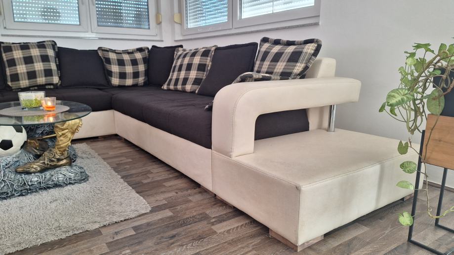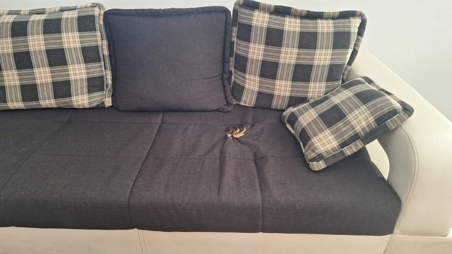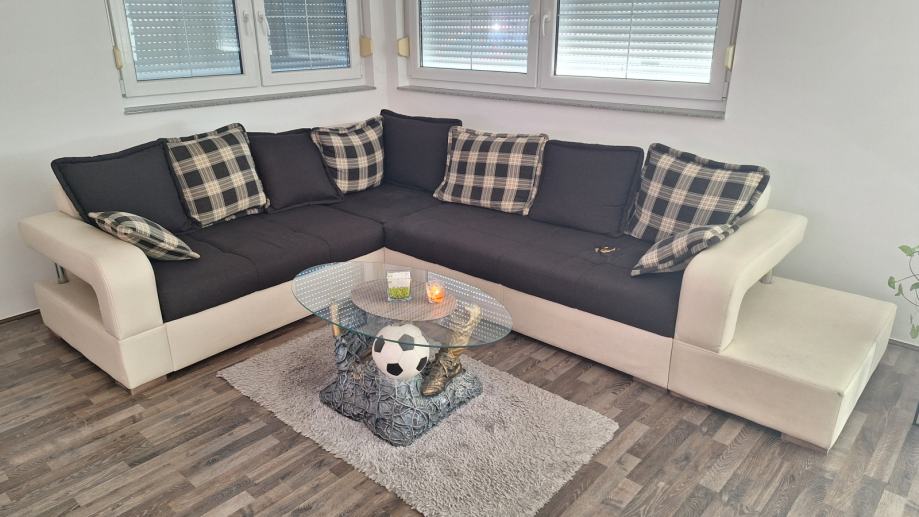 Na prodaju kutna garnitura, 230x320. Vidljivo oštećenje na mjestu gdje se najviše sjedi. Nije na razvlačenje. Uz garnituru dolazi 8 velikih i 2 manja jastuka. Garnitura dostupna kroz mjesec dana. 300€