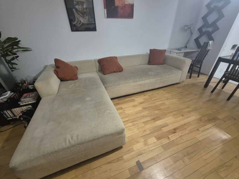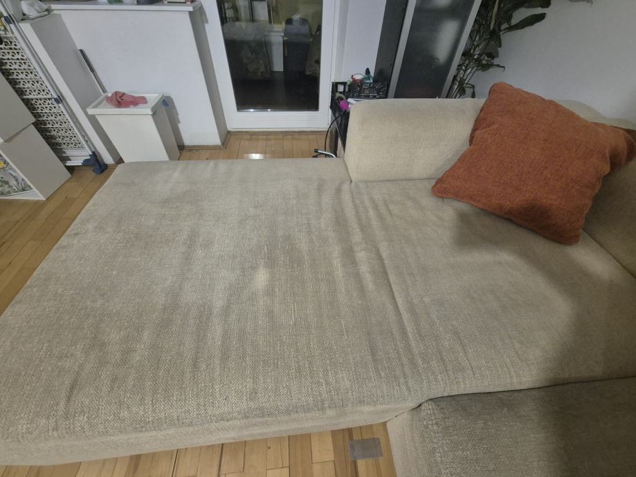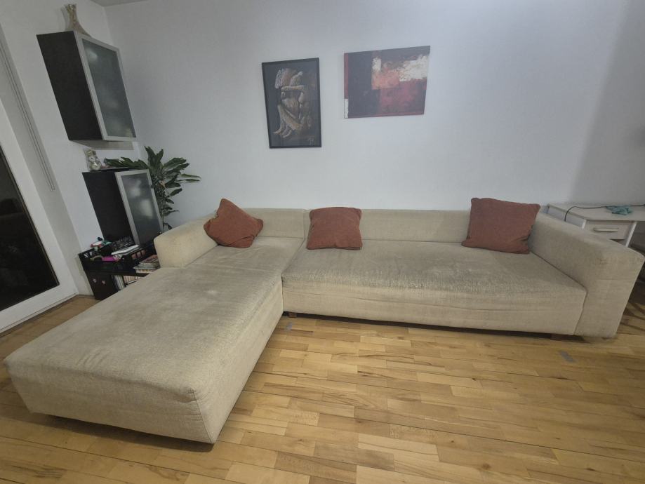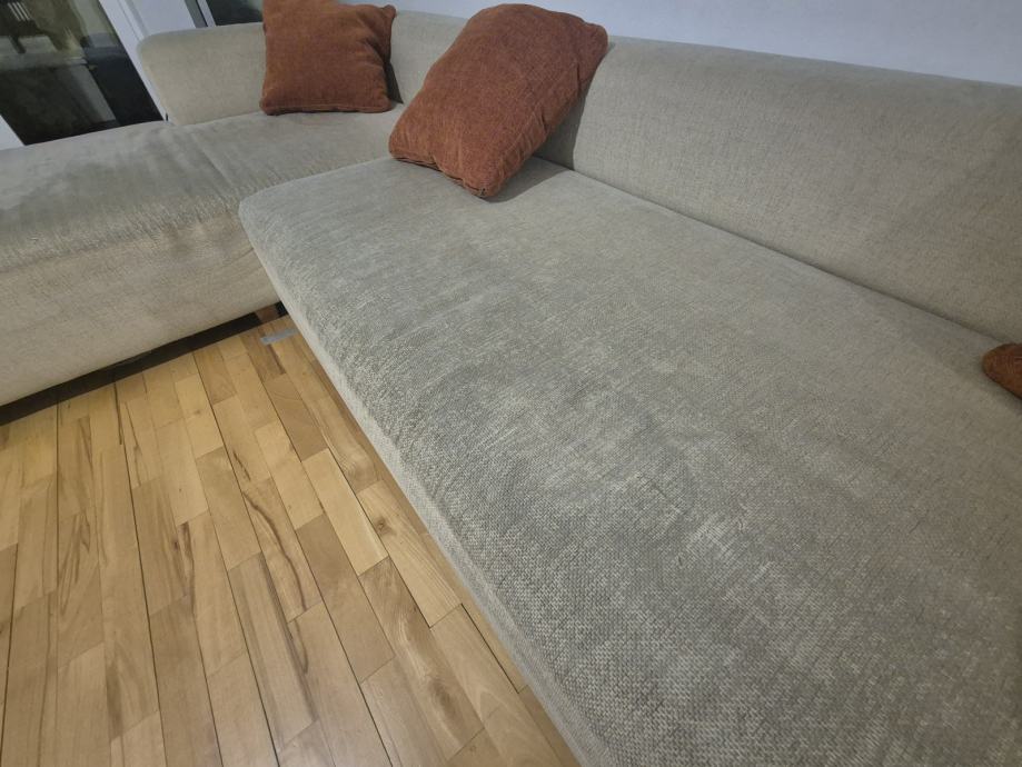 Kutna garnitura bež boje ukupne dužine 330 cm. Vrlo kvalitetna i masivna. Potrebno je dobro oprati i eventualno pretapecirati. Materijal je vrlo kvalitetan. Na nekim dijelovima se materijal stanjio, ali nije poderan.