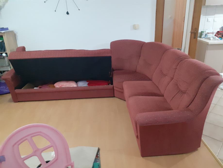 Prodajem korištenu kutnu garnituru na rasklapanje s ladicom, dimenzije 270X 240, neoštećenu