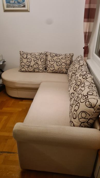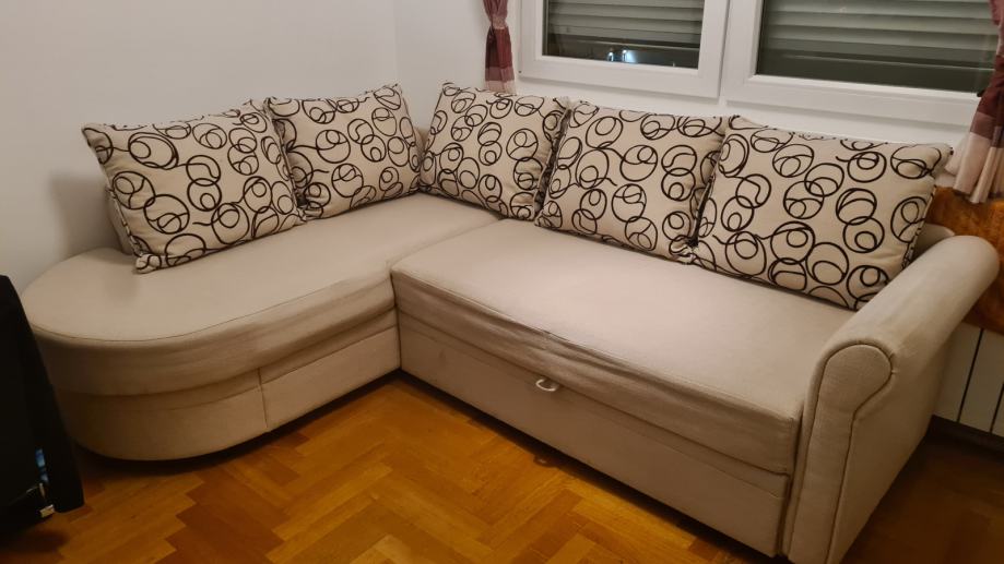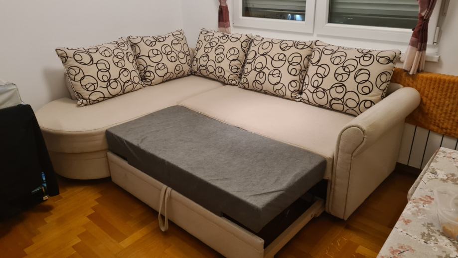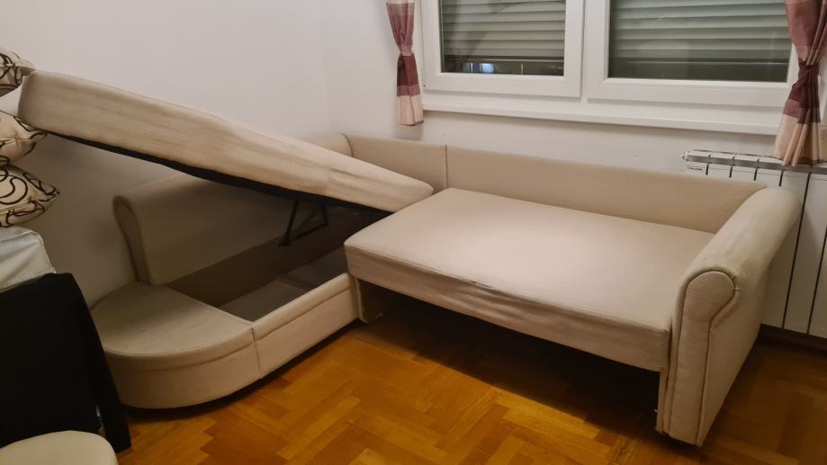 Kutna garnitura na razvlačenje sa pretincem za skladištenje stvari. Dimenzije 230x170 cm, dubina 75 cm.
