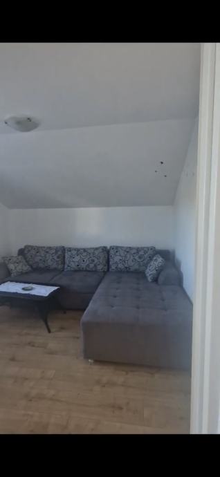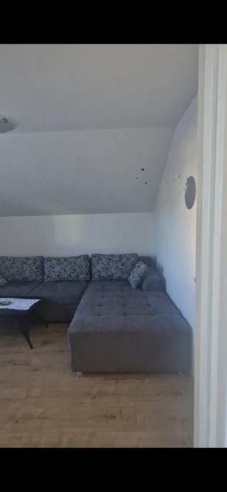 Prodajem jednu kutnu garnituru sive boje, koja se može razvući. Ima na jednom mjestu malu rupicu, koju se i nevidi, jedino kada se blizu gleda. Tamnija siva boja, pa nije osjetljiva. Inače je uvijek prikriven, strašno komotan za ležati i spavati. Nije nigdje propao, ništa. Korišten nešto više od godinu. Bude veliki ležaj kada se razvuče. Duža strana ima 3 m, 2 m kraća i šira strana.