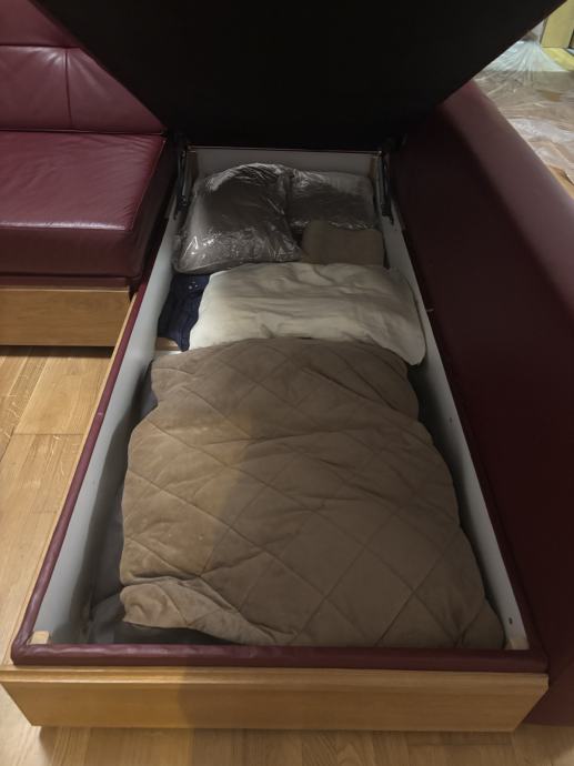U odličnom je stanju sto se može vidjeti iz priloženih slika, površine za sjedenje su uvijek bile prekrivene i ne samo da nemaju nikakve ogrebotine već nemaju niti utore od sjedenja što je i za očekivati od ove klase namještaja. Garnitura ima box za posteljinu i ležaj što se vidi i iz priloženih fotografija.