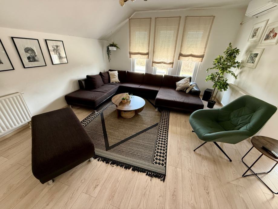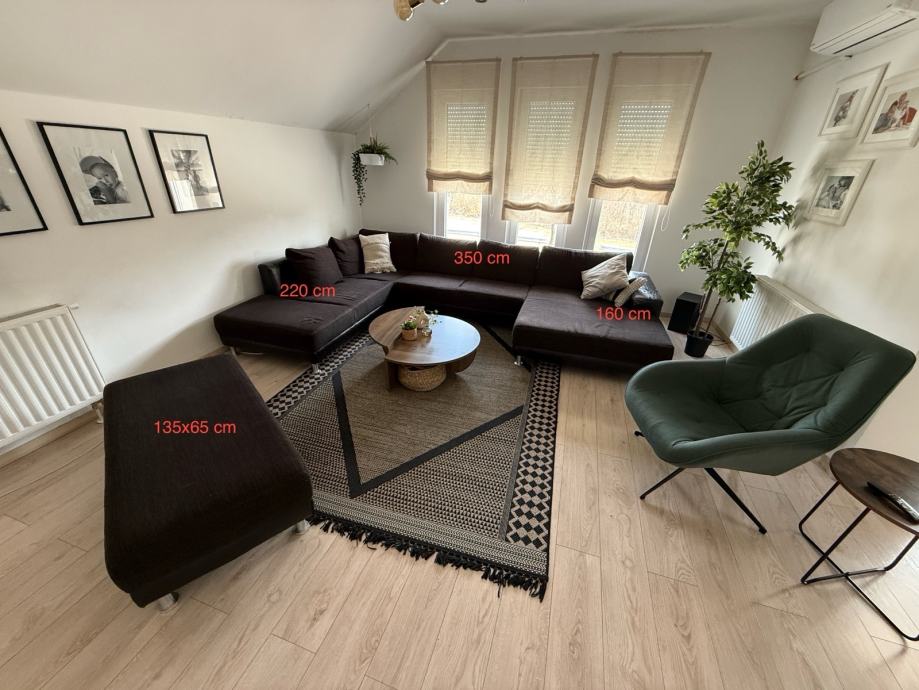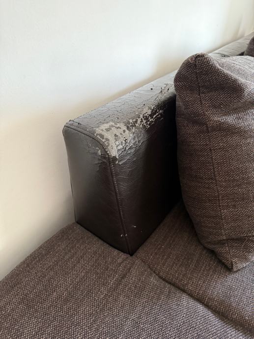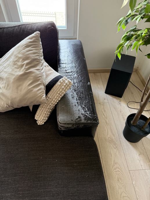 Garnitura ima oštećenje na stražnjem kožnom dijelu (vidljivo na fotografijama), ali je inače u dobrom stanju.