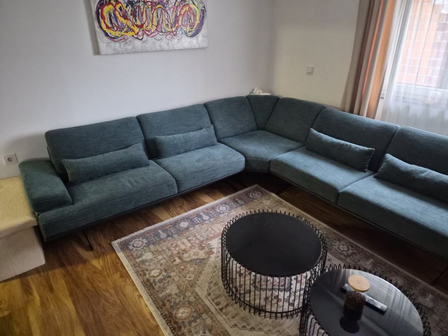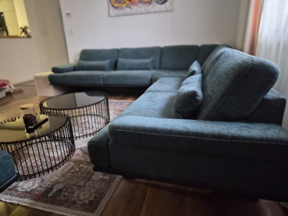 Prodajem kutnu garnituru i tabure u setu, kupljenu prošle godine, originalna cijena 5000€, stanje odlično, sve funkcije naslona rade savrseno
