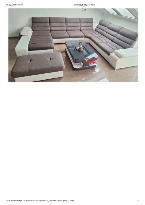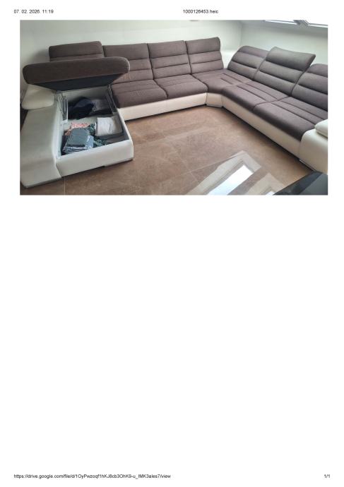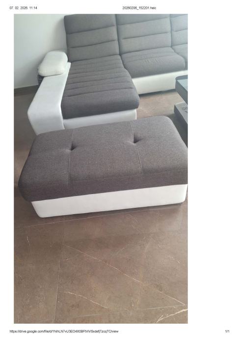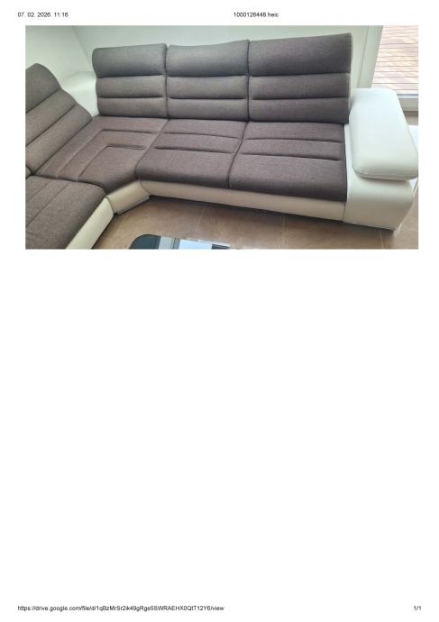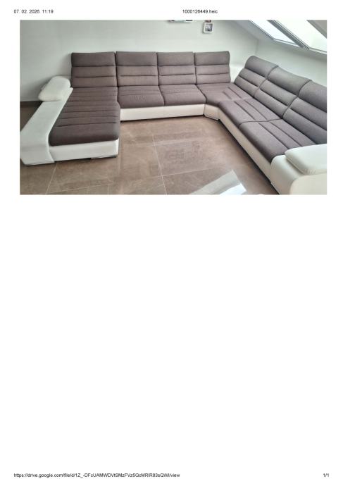 Prodajemo veliku kutnu garnituru u jako dobrom stanju, staru 4 godine. Tkanina + eko koža. Oblik garniture je slovo U, desni dio je damski, a kut je lijevi. Dimenzije garniture 1,80x3,60x2,80 m. Sadrži i veliki ležaj na razvlačanje (nikada korišten).Damski dio je kutija za odlaganje posteljine ili nekih drugih stvari. Nasloni za glavu se mogu pomicati naprijed - nazad. Samo na jednom manjem dijelu naslonjača za ruku je vidljiva dotrajalost eko kože, što je priloženo na slici. Ostalo je u odličnom stanju. Uz kutnu garnituru ide i veliki tabure, dimenzije 1,05x0,65 m.