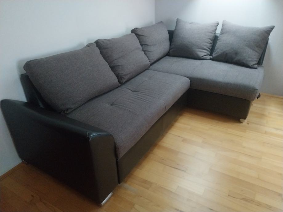 Prodajem kutnu garnituru kupljenu u Lesnini, dim.240×150 cm na razvlačenje (dodatni ležaj) i spremištem, 5 jastuka. Garnitura je vrlo udobna i očuvana (tek minimalno oštećena na rukohvatu, prikazano na slici) nedavno kemijski očišćena.