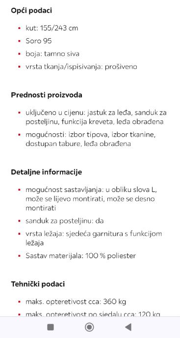 Garnitura stara oko godinu dana.Plaćena oko 670 u Lesnine. Dimenzije kut: 155/243 cm, reverzibilna(Moze lijevo i desno). Stanje kao nova. Prodaje se zbog mjenjanja stana. Kupac može pogledati...CIJENA PO DOGOVORU
