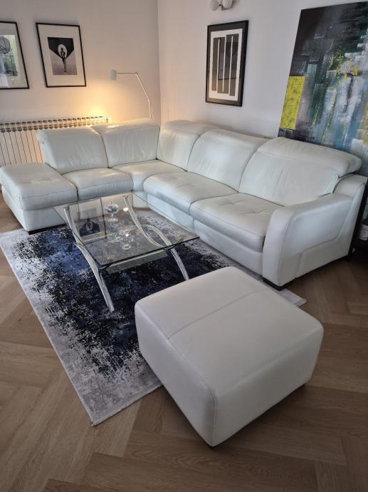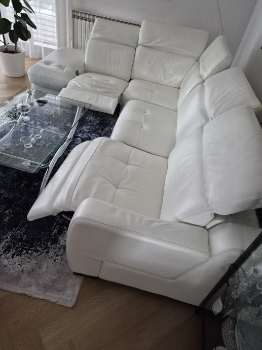Prodajem bijelu kožnu garnituru sa tabureom. Dimenzije su 290x220. U odličnom stanju, održavana. Ima jednu opciju električnog izvlačenja sjedala u poluležeći položaj te s druge strane mehanički podizač.
