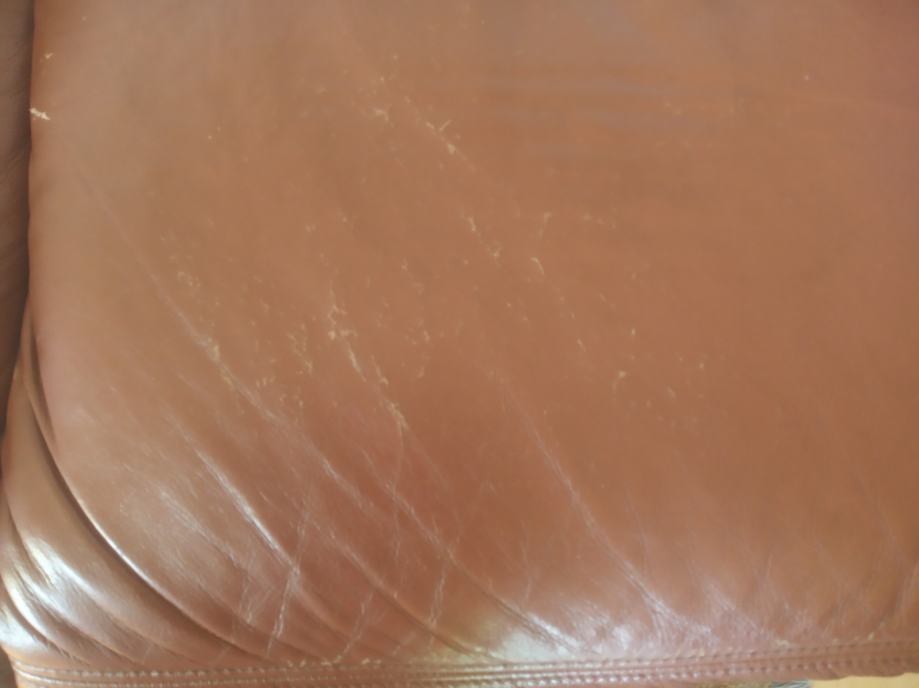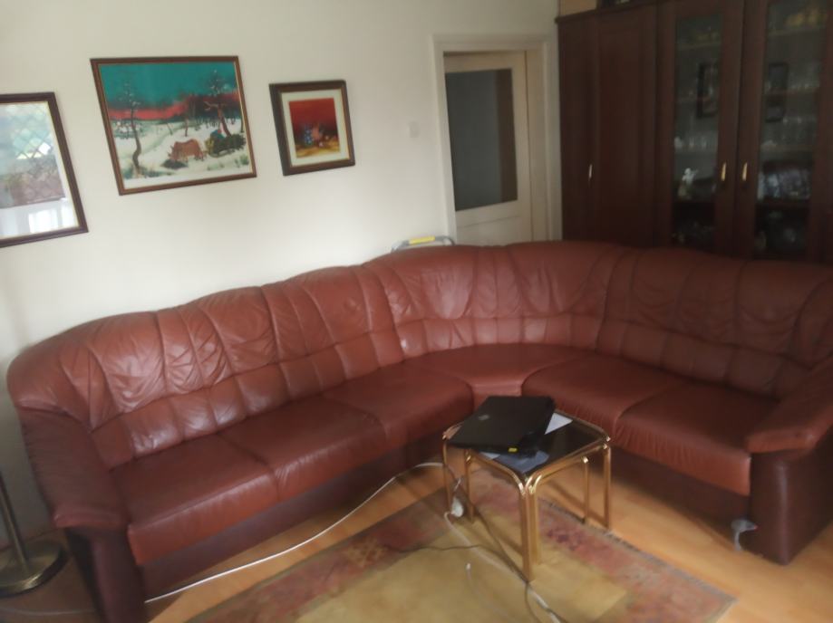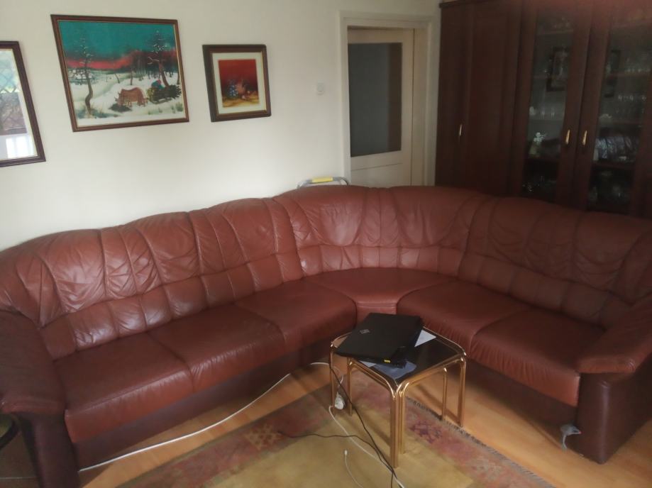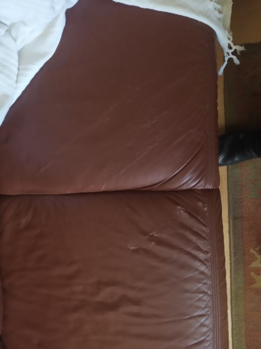 kUTNA KOŽNA GARNITURA BOJE KONJAKA-SMEĐA. Masivna je a sastoji se od trosjeda, kuta (desnog) i dvosjeda. Koža je proštepana sa malim naborima.Rukohvati su sa svake strane. Dimenzije 250x220x85 cm.. Ima oštećenje na sjedalu trosjeda. Dvosjed i kut su OK. Nije na razvlačenje.