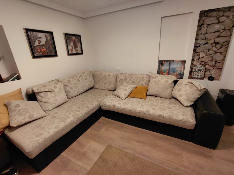 Kutna garnitura 280 x 220 cm. Solidno stanje. Na dužem dijelu jedna opruga za sanirati.