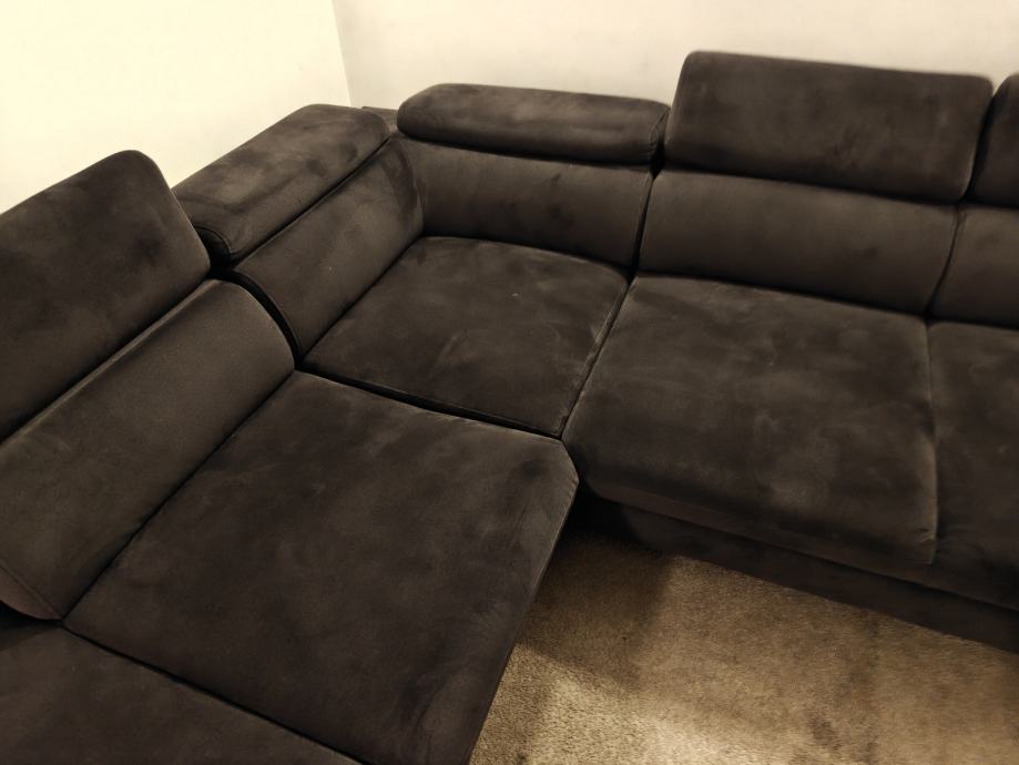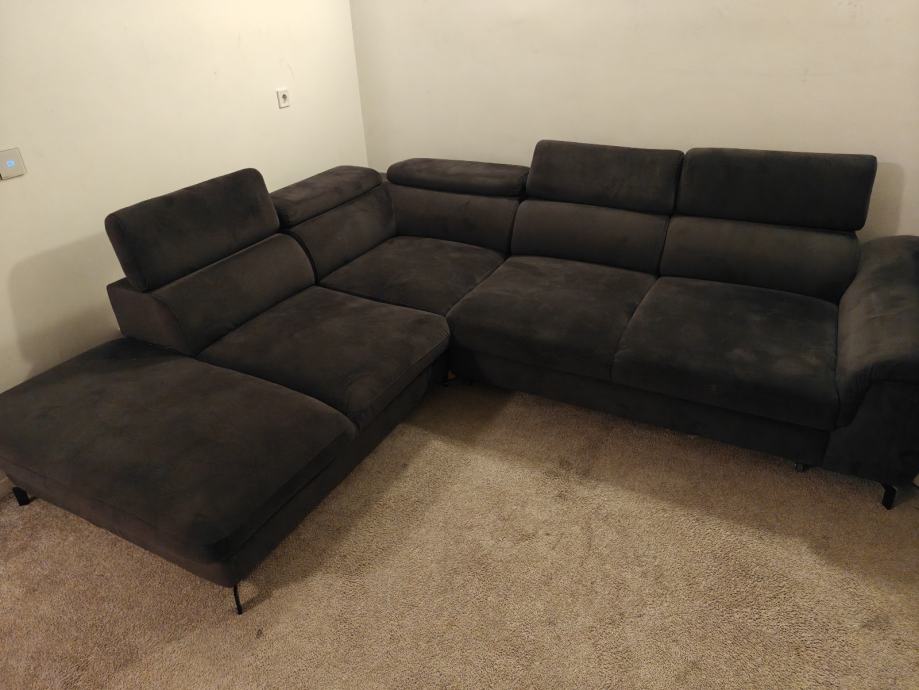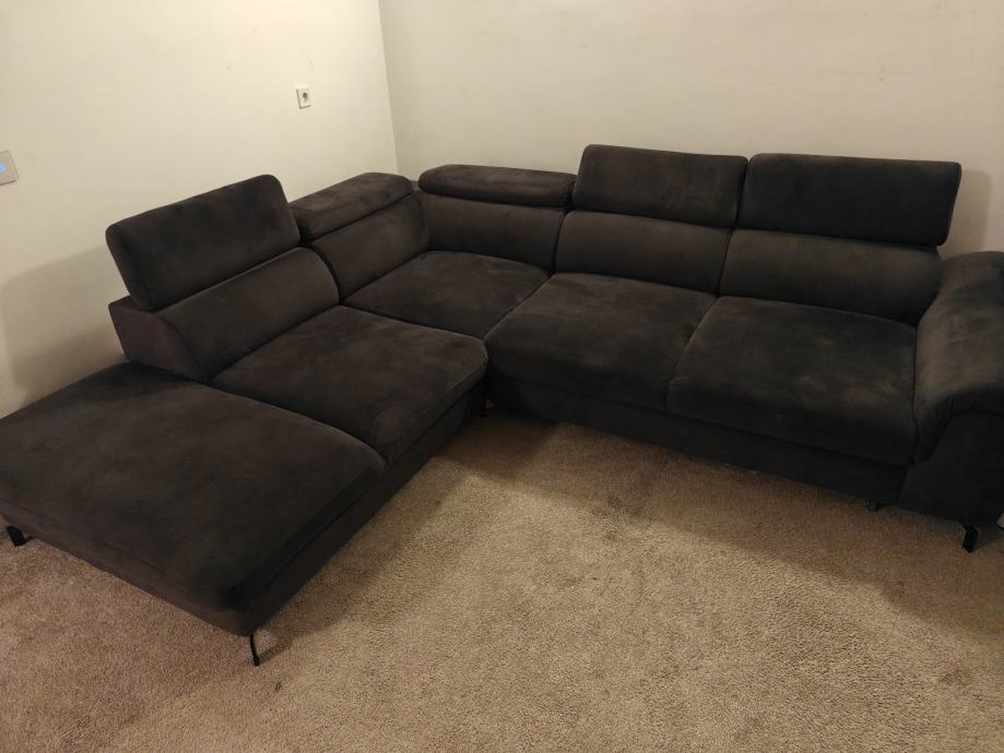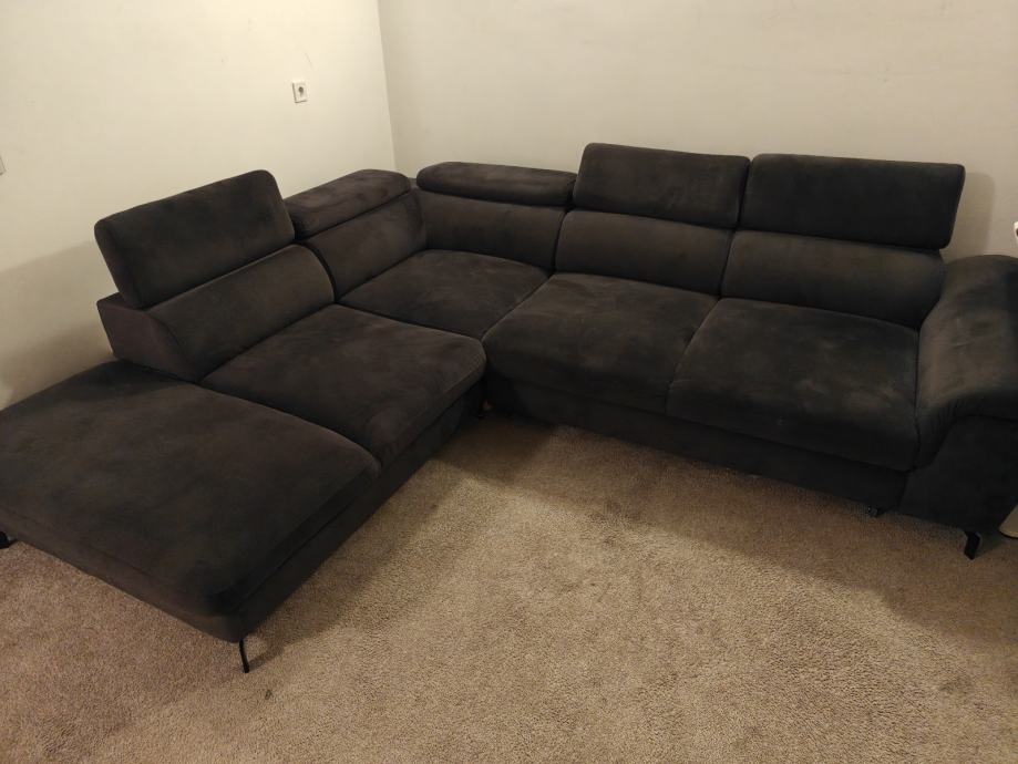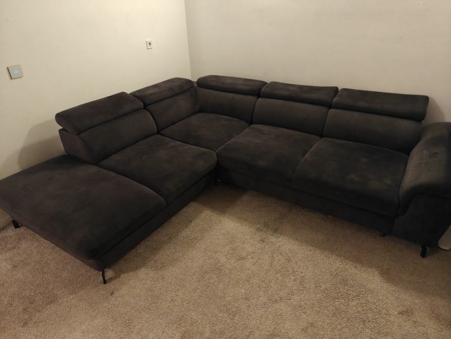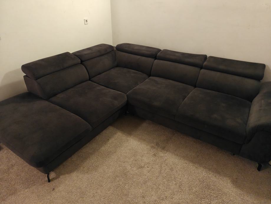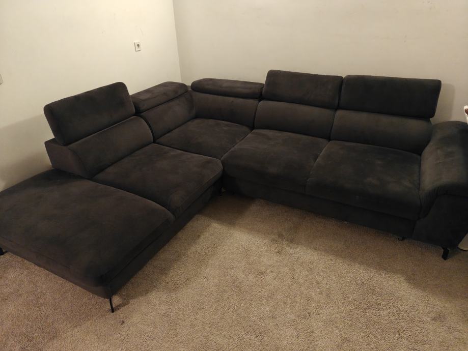 Poklanjam kutnu garnituru tamnosive boje od pliša. Garnitura je kutnog oblika s duljim dijelom na jednoj strani i kraćim ležajnim dijelom na drugoj. Nasloni za glavu su podesivi, a noge su metalne tamne boje. pomoćni ležaj (koji je sakriven i koji se razvlači) jedino treba popravak. Morate si sami osigurat prijevoz