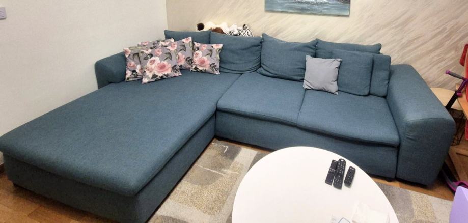 Prodajem kutnu garnituru u zelenkasto tirkiznoj boji, koja izgleda kao nova. Garnitura je prostrana, s dubokim sjedištem i velikim ležišnim dijelom s lijeve strane, što ju čini izuzetno udobnom za svakodnevno korištenje.Tkanina je čista i dobro očuvana. Garnitura će odgovarati većem dnevnom boravku dimenzije 305 cm sa 185 cm