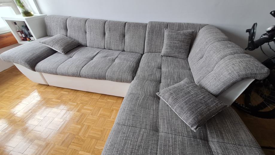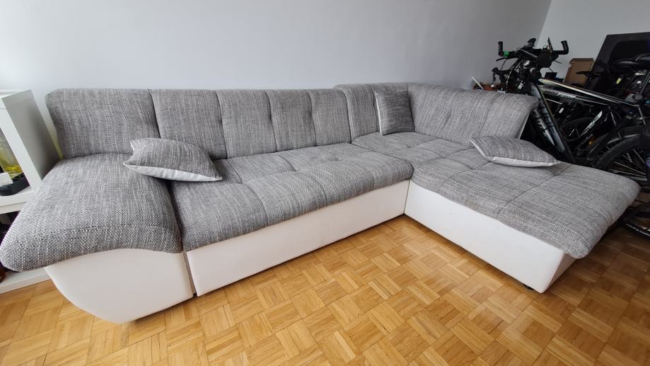 Prodajem rabljenu kutnu garnituru u dobrom stanju. Lokacija Utrina, Novi Zagreb. Potrebno organizirati vlastiti prijevoz. Kauč ima mogućnost razvlačenja te onda čini ležaj približno 270x185 cm. Ležaj je sklopljen u plitku ladicu na koju stane i nešto sitno posteljine.