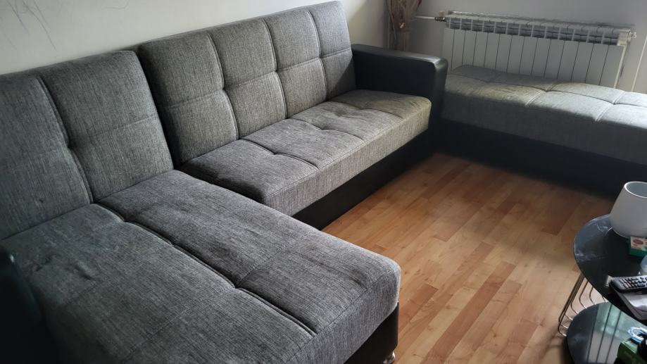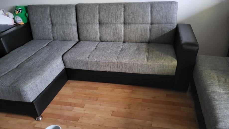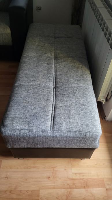 Prodajem rabljenu kutnu garnituru na razvlačenje sa spremnikom i pripadajućim tabureom.