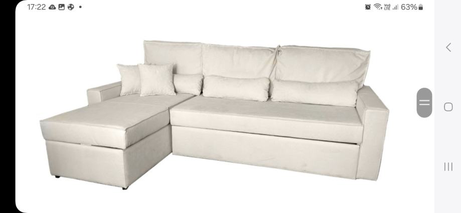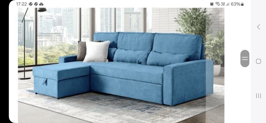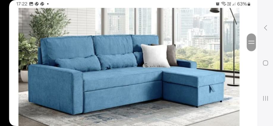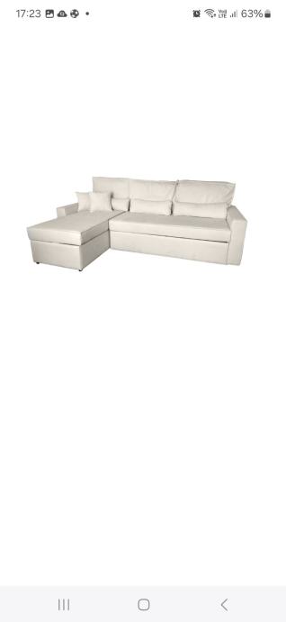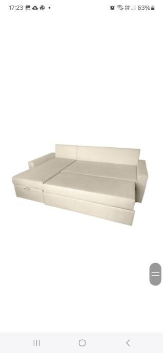 Nova u original pakiranju univerzalna kutna garnitura Nora dimenzije 240x160 cm.Širina dramskog ležaja 60 cm.Dubina sjedeceg dijela 50/66 cm. Garnitura ima pomočni ležaj dimenzije 152x210 cm i kutiju za posteljinu dimenzije 146x60x26 cm.Visina nogica 4 cm. Punjenje val opruga i Pu pjena. Dolazi sa 6 jastuka kao na slici. Dostupna odmah sa skladišta u bež stofu Timor New 102. Racun i garancija. Za dodatne info molim zvati na 091/1975-711