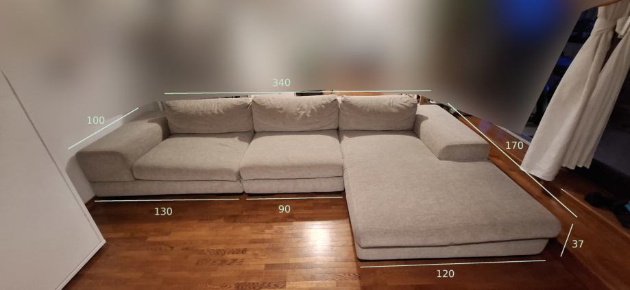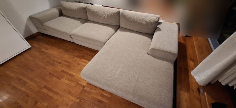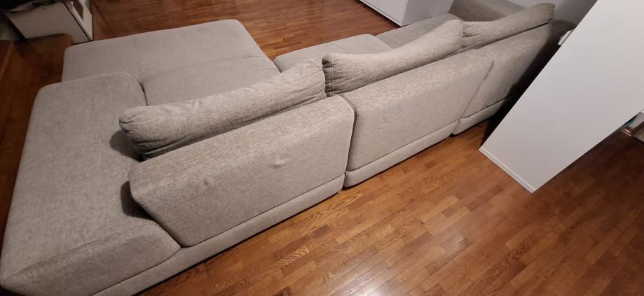 Niskopodni kutni kauč s tri odvojiva/spojiva dijela pa se može pretvoriti u fotelju i manji kauč, ne grebe parket, u vrlo dobrom stanju (nema fleka ni poderotina), jastuci su odvojivi zip-om. Dizajniran je bez rasklopivog kreveta. Dimenzije su navedene na slikama.