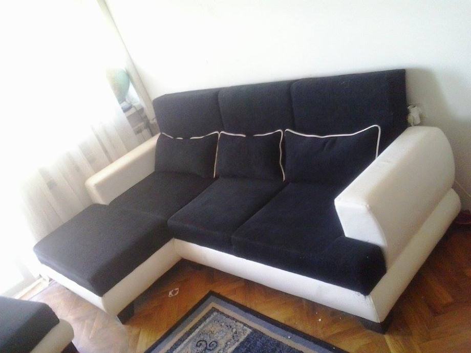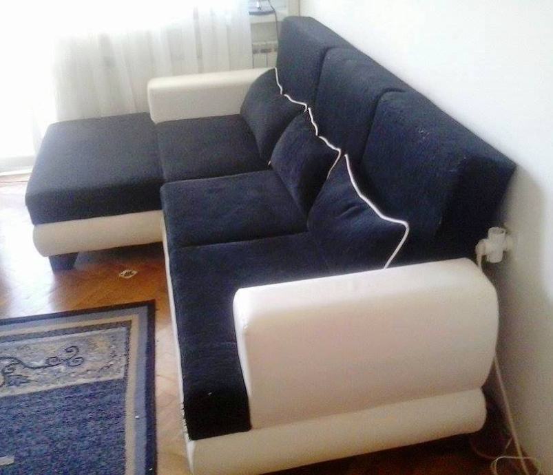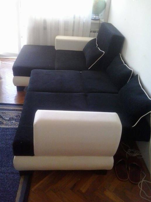 Prodajem tamno plavu kutnu garnituru na razvlačenje. Garnitura je stara tri godine, a kako u kućanstvu imamo mačku, po rubovima garniture postoje tragovi cufanja, ali nisu previše vidljivi. Garnitura se razvlači tako da se spuste nasloni koji su podesivi po stupnjevima. Uz garnituru ide još jedan dio (fotelja) na kojem je pukla letvica pa ne stoji kako bi trebao, no mehanizam je u redu pa bi se to lako moglo popraviti. Cijena nije fixna.