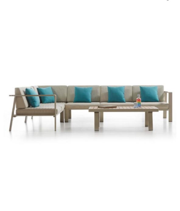 Kutna garnitura Nofi, boje šampanjca, moderna je i elegantna, a istovremeno praktična i udobna garnitura. Jastuci od kvalitetne vodoodbojne tkanine i spužve, čine Nofi vrlo udobnim komadom namještaja za terase.
