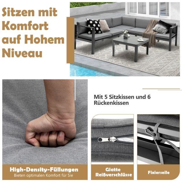 Ovaj 3-dijelni set sjedeće garniture od aluminija pruža vam idealno mjesto za opuštanje na otvorenom i u zatvorenom prostoru. S 6-stupanjski podesivim naslonom za leđa, trosjed ne samo da pruža prostran prostor za sjedenje, već vam omogućuje i da se naslonite za veću udobnost. Sjedalne i leđne jastuke s punjenjem visoke gustoće čine sjedište mekšim. Dizajn s patentnim zatvaračem omogućuje jednostavno uklanjanje i pranje navlake za jastuk. Osim toga, sva 3 dijela su vrlo stabilna s ojačanim aluminijskim okvirom. Staklena ploča stola od kaljenog stakla, pričvršćena vakuumskim držačima, je glatka i jednostavna za održavanje. Općenito, ovaj moderni set sjedeće garniture od aluminija savršen je za unutarnje i vanjske prostore.