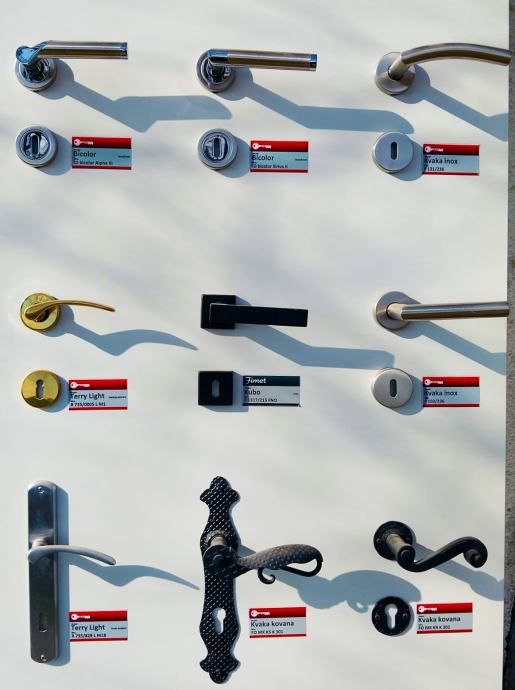 Panel izložbenih raznih metalnih kvaka sa rozetama za sobna vrata (inventar zatvorene trgovine), inox, kovano željezo, mat crna, Made in Italy, novo nekorišteno. Na prodaju je samo ono što vidite na slikama tj. kvake nemaju drugu stranu (nisu kompletne, nisu u setu) !