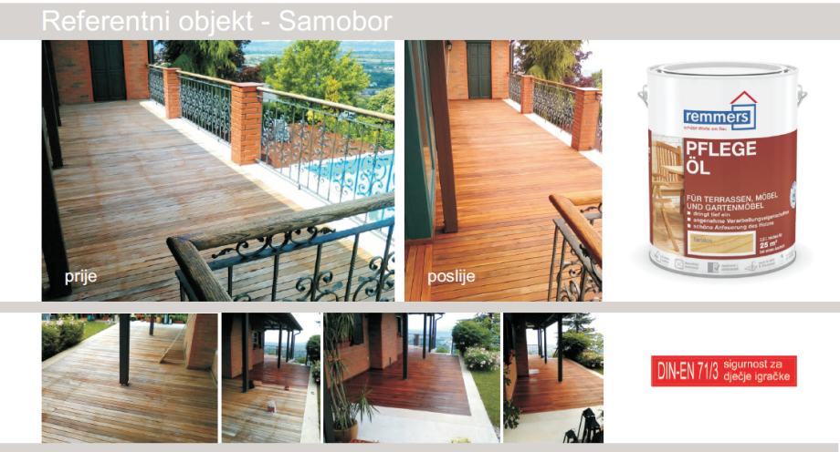 Drvene/WPC terase treba povremeno ponovno tretirati uljem, barem jednom godišnje, kako bi se očuvala zaštita i izgled.