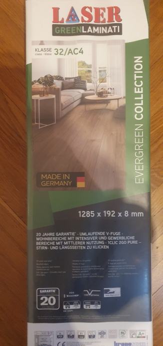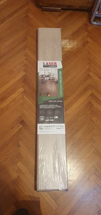Laminat laser green 32/AC4 8mm, 11 paketa x 2.22m2 =24.4m2. Prodajem sve, ne pojedinacne pakete. Važna napomena: Potrebno je odnijeti pakete iz stana na 1.katu. Nisam u mogucnosti pomoci nositi.
