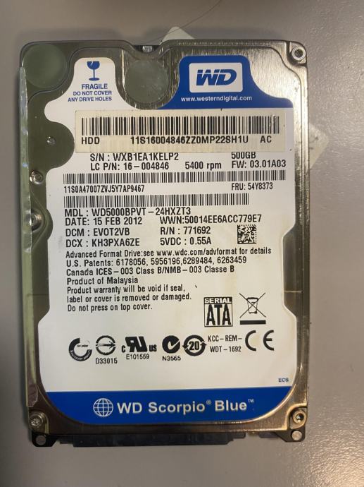 HDD 500 GB WD, SATA 2, 5400 o/m, 8MB cache, 508 radnih dana, besprijekoran --- 10 €
