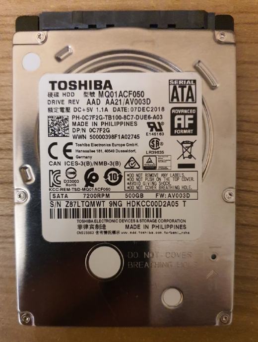 HDD SATA 2,5" TOSHIBA 500GB MQ01ACF050, koristen, ispravan.