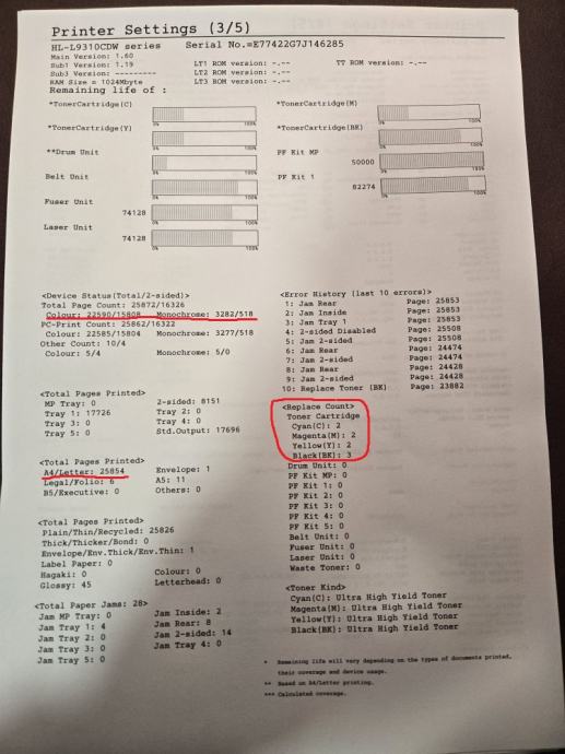 Stanje tonera vidljivo na fotografiji. Priložio sam i printer report gdje je točno vidljivo koliko je stranica isprintano, koliko je puta toner mijenjan, koliko je puta printer zakazao u ispisu (errori/paper jam) i sl.
