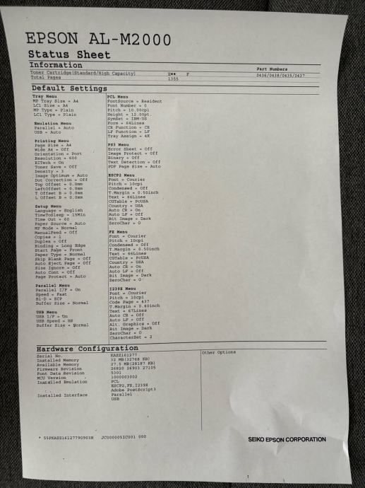 Full duplex laserski printer koji je vrlo rijetko koristen i ukupno je isprintao 1355 stranica