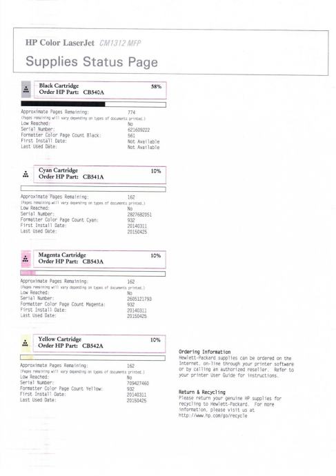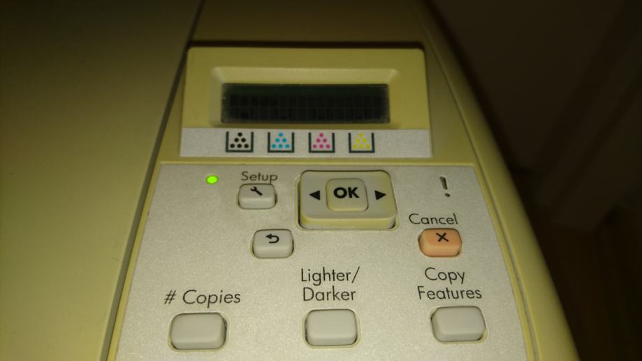 Crni toner je originalni HP i ima ga još 58% (za ispis još oko 774 stranica) dok su toneri u boji zamjenski i ima ih još oko 10% (za ispis još oko 162 stranice). Zamjenski toneri nisu dobri i nisu bili dobri ni kada su kupljeni.