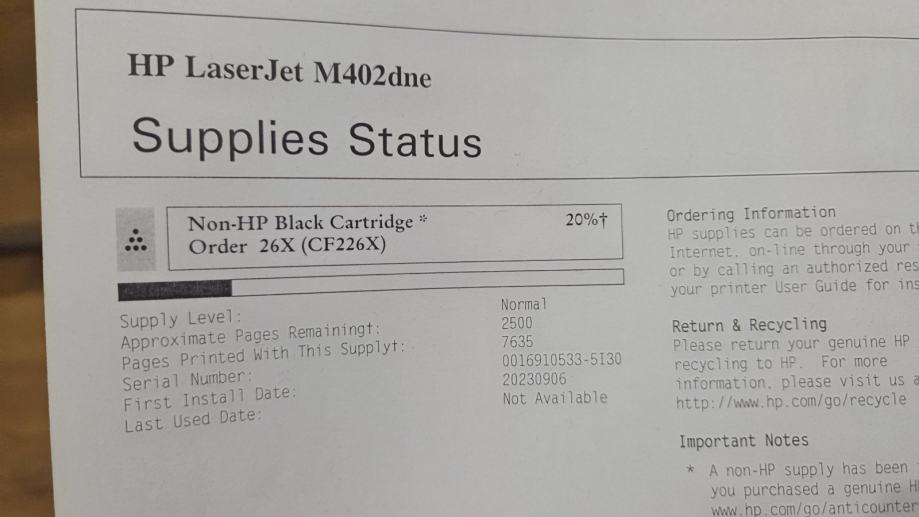 Toner je na 20 posto - za otisnuti još cca 2500 stranica.