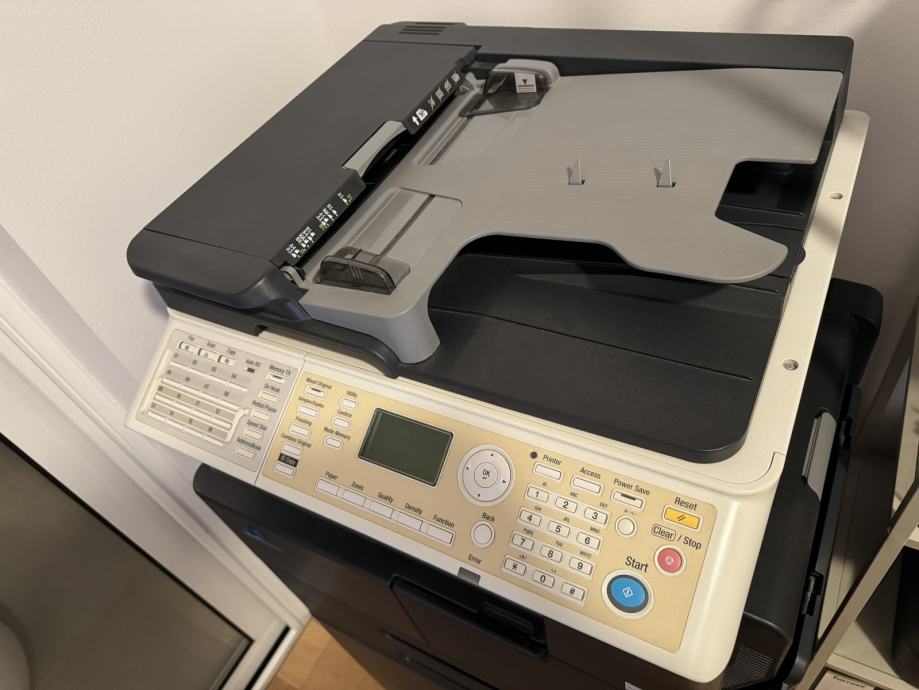 Uređaj ima dvije ladice za A3 / A4 papir, spremišni ormarić / bazu na kotačima i automatski ulagač dokumenata.