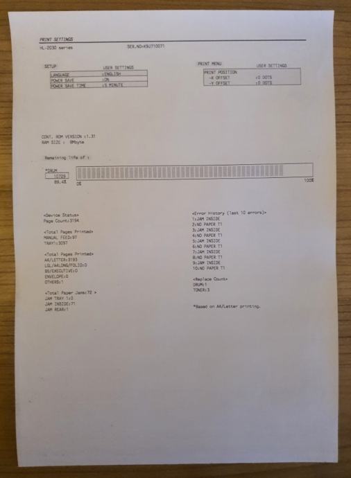 Pisač malo korišten, odličan, ispisao cca 3200 stranica, bubanj na 89%, vidljivo na test page-u, toner skoro pun.