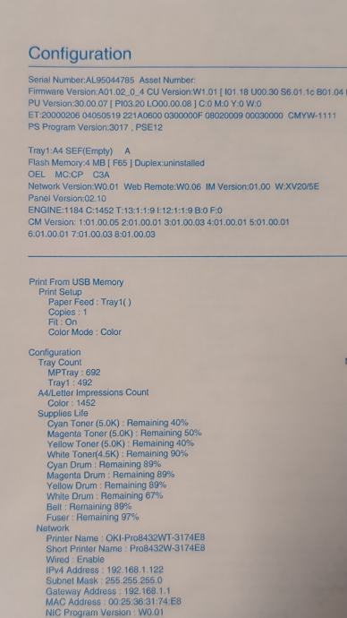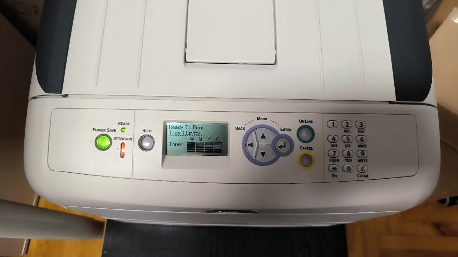 Stanje printera je gotovo kao nov, odradio je ukupno 1452 printa (sve dok se ne proda naravno broj može neznatno porasti). Stanje drumova i boja vidljivo na slikama, također većina potrošnih komponenata kao nova.