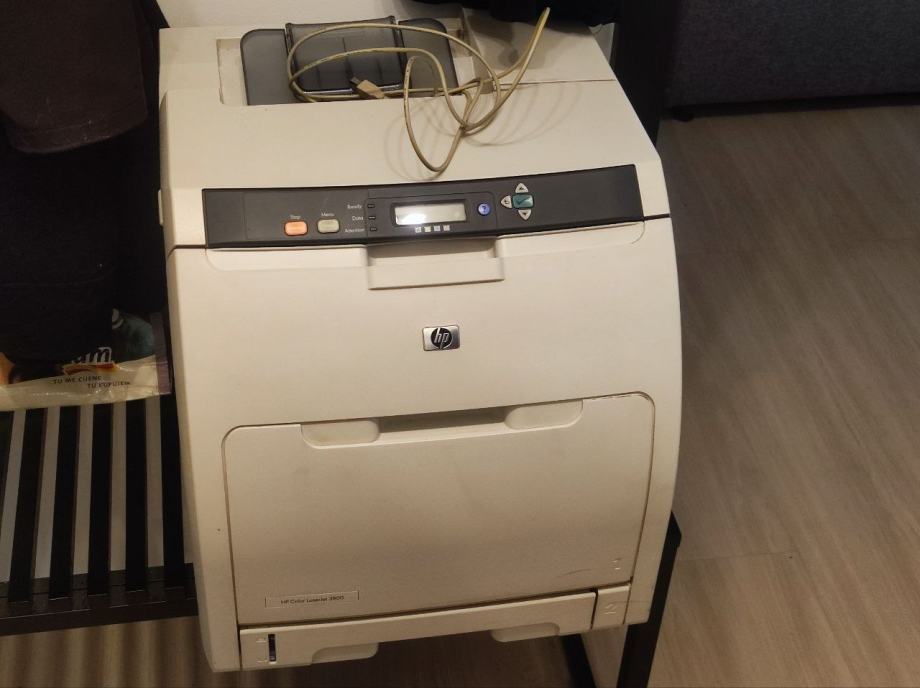 Prečko Zagreb. Printer HP color Laserjet 3800 neispravan - lijeva gornja polugica od crnog tonera se klima i treba je zamjeniti/zaljepiti/popraviti. Dolazi sa 4 tonera i kablom usb. Težak je 28 kila.