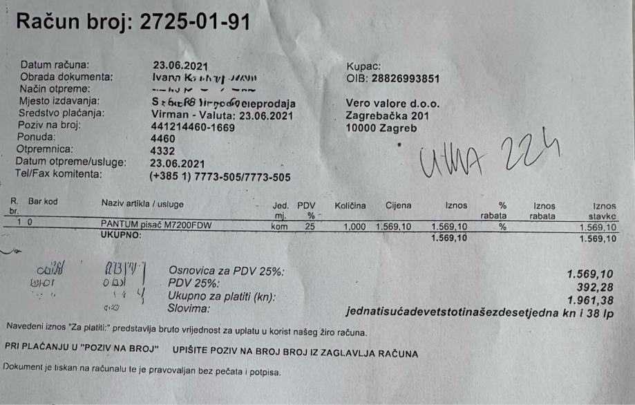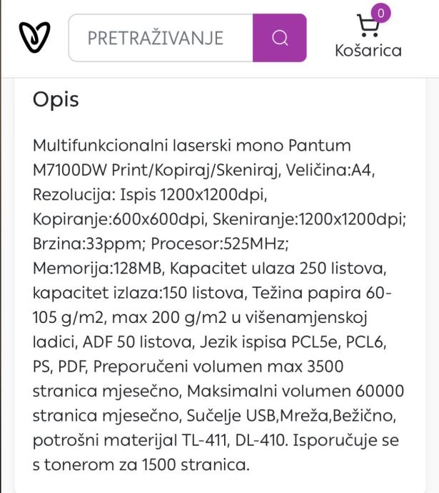Prodajem rabljeni multifunkcijski laserski pisač Pantum M7100DW s funkcijama ispisa, kopiranja i skeniranja. Uređaj podržava A4 format, brzinu ispisa od 33 stranice u minuti te ima mrežno i bežično povezivanje. Printa obostrano. Printer se prodaje s firme u sustavu PDVa . Iznos fakture je s PDVom . Printer je jako malo korišten .