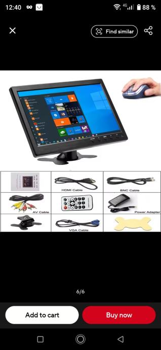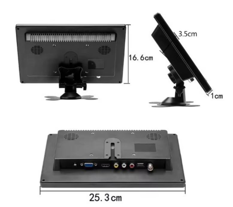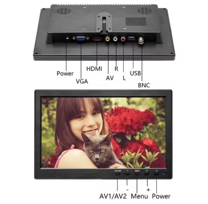 Odličan mali 10" LCD ili TV monitor pogodan za korištenje u raznim situacijama i potrebama, za videonadzor, kao TV (uz upotrebu dodatnog vanjskog DVB-T2 prijemnika), kao dodatni ili serverski PC monitor, ekran za rikverc kameru, za prikaz slike analognog video signala (SCART ili CVBS), za spajanje na analogne kamere video nazora, itd. Ugrađen zvučnik. Moguća montaža na zid (VESA standard).
