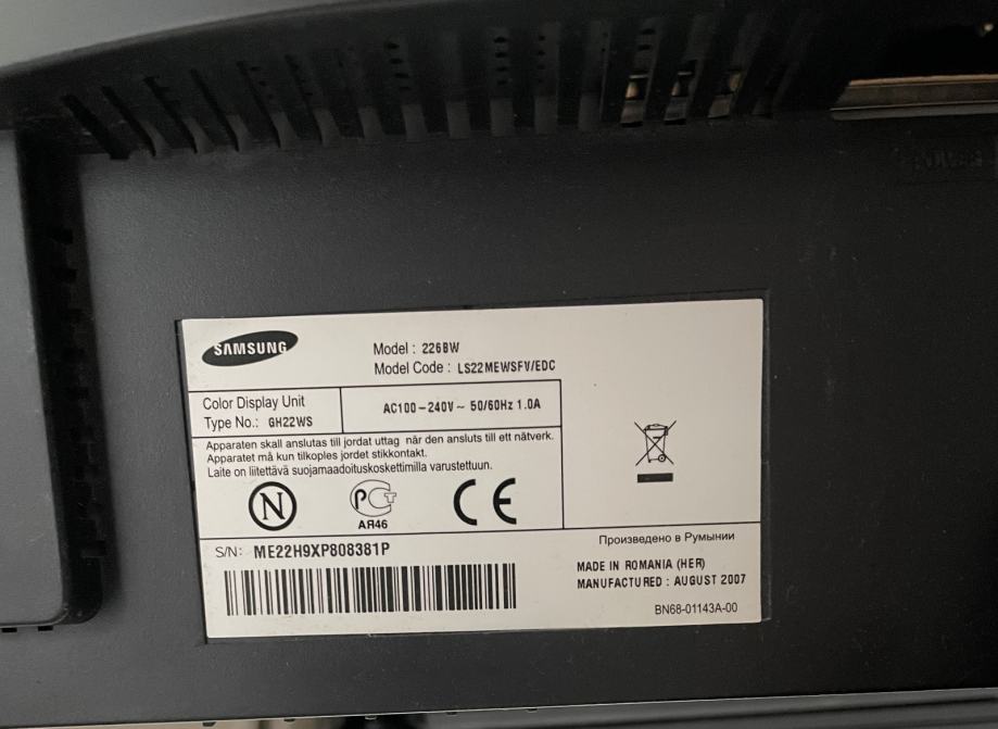 Monitor 22 inča Samsung SM226BW SyncMaster LCD/TFT, VGA/DVI ulaz, rezolucija 1680x1050, format ekrana 16x10, ima postolje podesivo naprijed/natrag, potpuno ispravan i neoštećen, malo korišten, kućni višak.