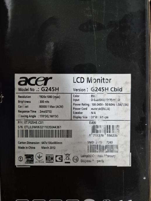 Prodajem Acer G245H 24-inčni LED monitor, pouzdan i kvalitetan model, idealan za uredski rad, rad od kuće ili multimediju.