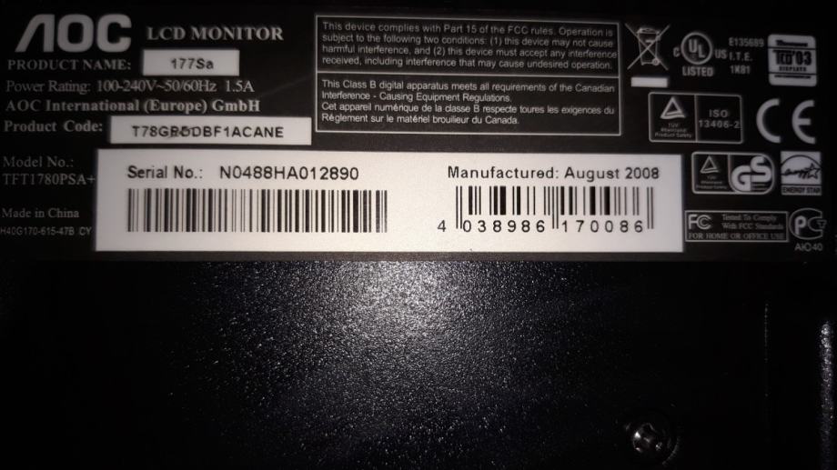 Monitor AOC 17" model 177Sa. Za kasu, ured, ili stan. Integrirani zvučnici.