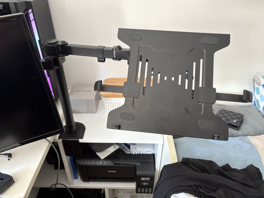 Stalak ima dvije ruke i jedan nastavak - stalak za laptop koji se može maknuti, Stalak za laptop može držati monitor najveće širine 38cm.