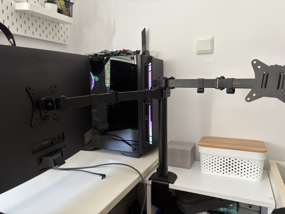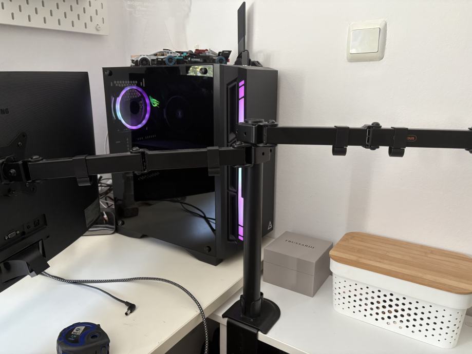 Kutija monitora i slatka nisu uključene. Visina stalka je 40CM, duljina lijeve ruke sa silke je 35cm, a desne ruke je 40cm. Stalak ima jednostavan sistem za ugradu na stol te se monitor ugradi na satalak sa šarafčićima koje dolaze uz stalak.