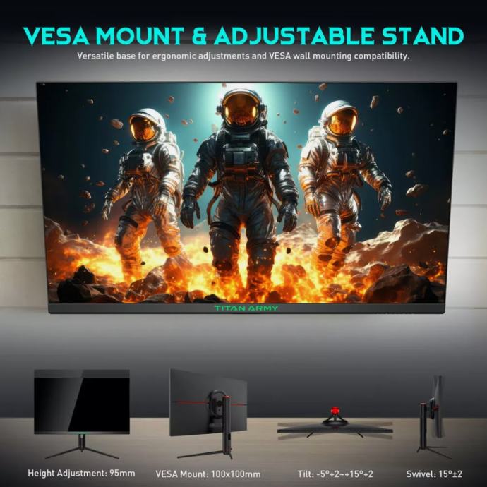 Podesivo postolje podržava podešavanje visine od 95 mm, nagib i bočnu rotaciju. Podržava VESA zidni nosač i mjeri 100*100 mm, pružajući različite mogućnosti postavljanja za ergonomsku udobnost. Također poboljšava atmosferu igranja ambijentalnim osvjetljenjem koje vam omogućuje da personalizirate svoje postavke.