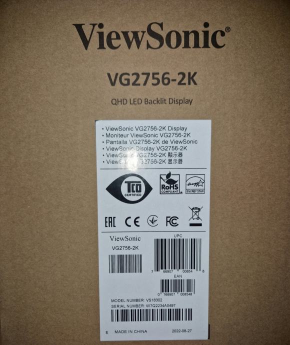 ViewSonic VG2756 monitor, IPS, 27", 16:9, 2560x1440/3840x2160, 60Hz, p