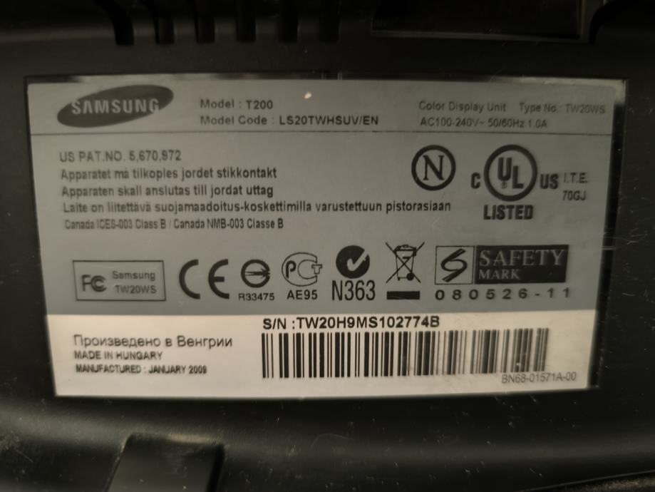 Prodajem monitor Samsung SyncMaster T200, dijagonala 20 incha, vrijeme odaziva 2 ms, odlicno ocuvan uz iznimku malog ostecenja vanjskog stakla u desnom gornjem kutu (vidljivo na slici), no bez efekta na kvalitetu slike i bez mrtvih piksela.