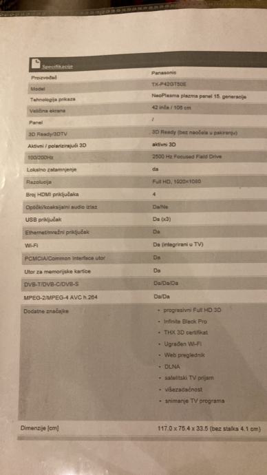 Prodajem neispravan Panasonic TX-P42GT50E plasma TV.