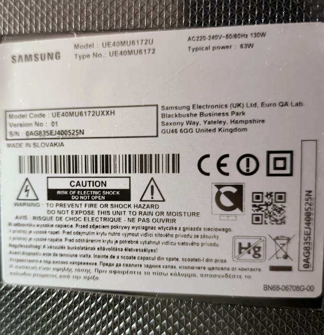 Samsung UE40MU6172U. Dijagonala monitora: 101,6 cm (40"), Razlučivost zaslona: 3840 x 2160 pikseli, Tip HD-a: 4K Ultra HD, Tehnologija zaslona: LED, Oblik zaslona: Ravni. Pametni televizor. Tehnologija interpolacije pokreta: PQI (Picture Quality Index) 1300, Omjer slike: 16:9. Sustav digitalnog formata signala: DVB-C, DVB-S2, DVB-T2. Wi-Fi, Ethernet LAN veza. Boja proizvoda: Crno